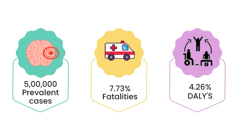 Stroke accounts for 7.73% of fatalities and 4.26% of DALYs in Karnataka, with an estimated 500,000 prevalent cases placing a significant burden on the healthcare system.